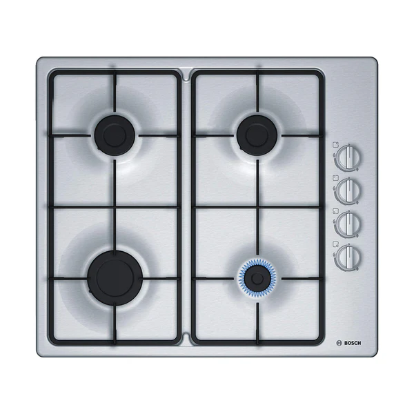 The Bosch PBP6C5B60Q Serie | 2 is a 60 cm stainless steel gas hob designed for efficient cooking with a sleek, modern look. It offers high performance with easy-to-use controls and durable construction.