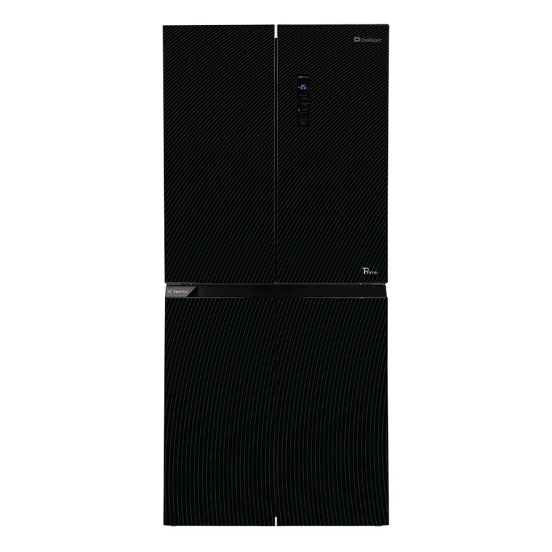 The Dawlance DMD 7950 Glass Door Inverter No Frost Refrigerator is a stylish and efficient appliance. It features a sleek black design and advanced cooling technology.