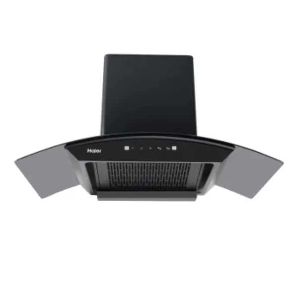 The HCH-9021 G is arc glass hood by Haier. It serves as a wall-mounted center hood and is 90cm wide, featuring a sleek design made of tempered glass.